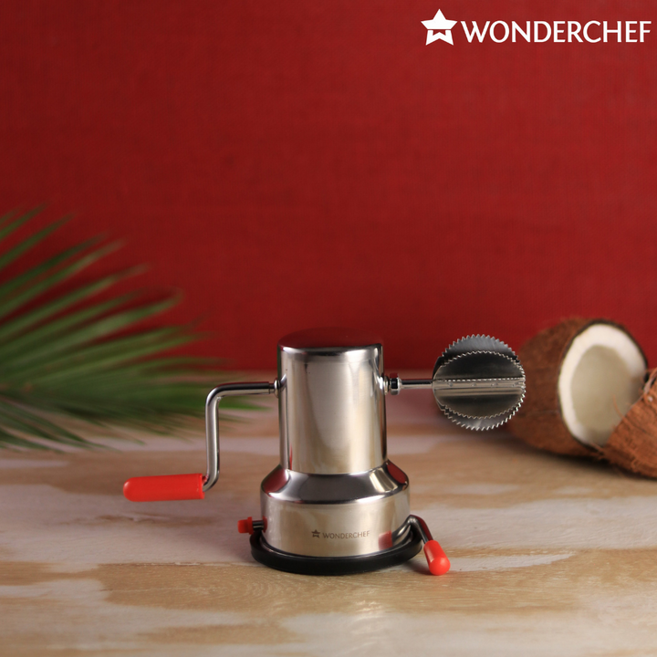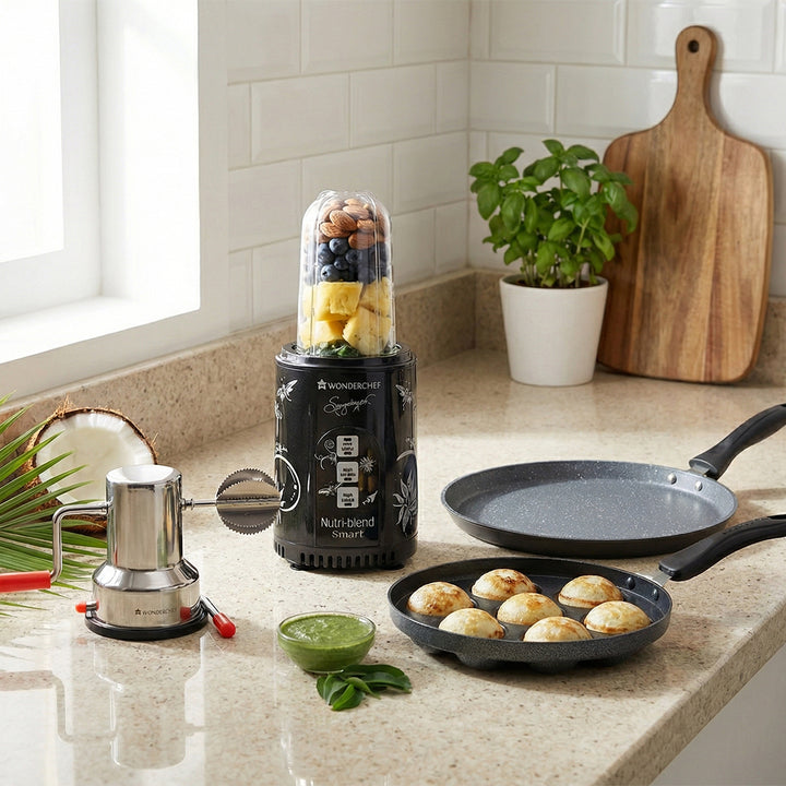 Desi Deluxe Breakfast Bundle | Duralite Die-cast 28 cm Dosa Tawa, Nutri-blend SMART Automatic Mixer Grinder, Non-Stick Appa Kara Cookware with 12 cavities, Stainless Steel Coconut Scraper