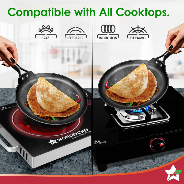 Ferro Light-weight Cast-iron Dosa Tawa, 26cm, 40% Lighter, Pre-seasoned with 100% Vegetable Oil, Non-toxic, Chemical-free, Induction-friendly, Long Cool-touch Wood Handles, 10-Yr Warranty
