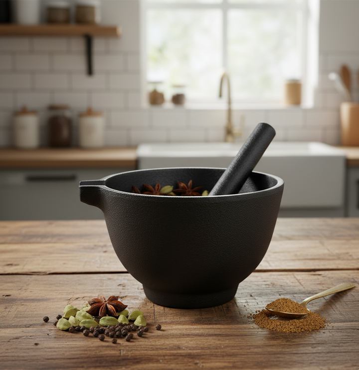 - Easy to use and clean every day, this traditional grinder will not assimilate food scent or masala stains. Relish the flavours of real Indian spices with Forza cast-iron mortar & pestle
