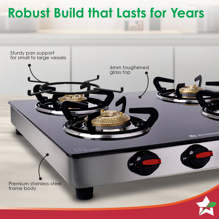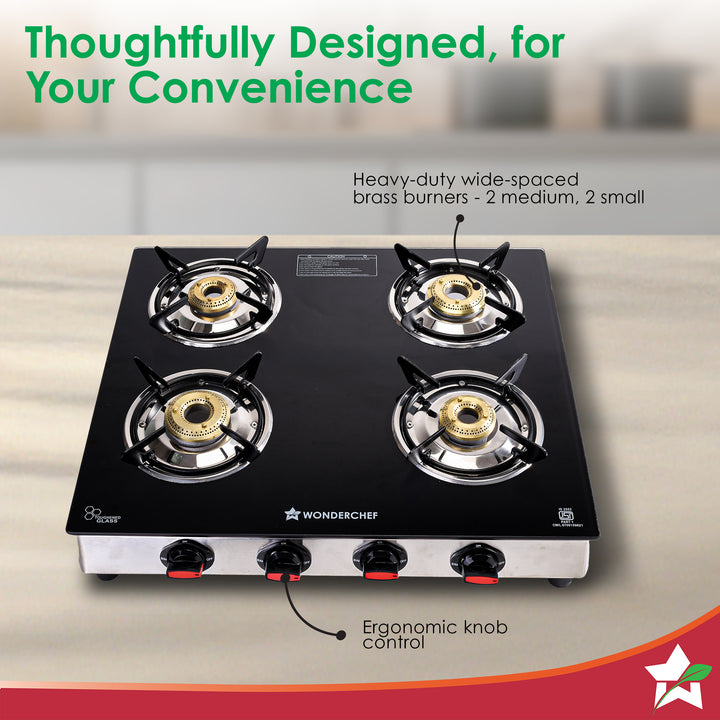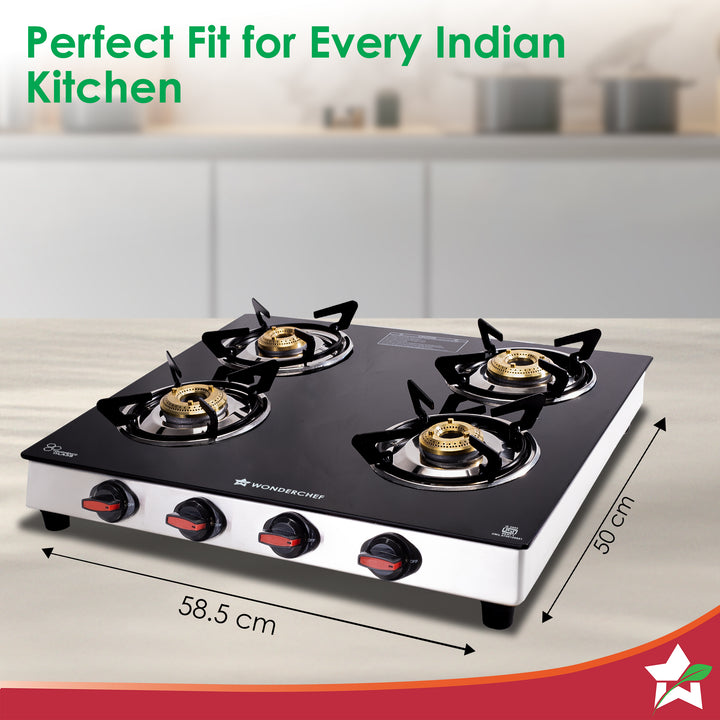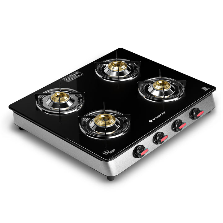 Galaxy Auto-Ignition 4 Brass Burner Cooktop, LPG Gas Stove for Kitchen, No Lighter Needed, ISI Toughened Glass Surface, SS Frame, Spill-proof Design, Ergonomic Knobs, 2-Yr Warranty