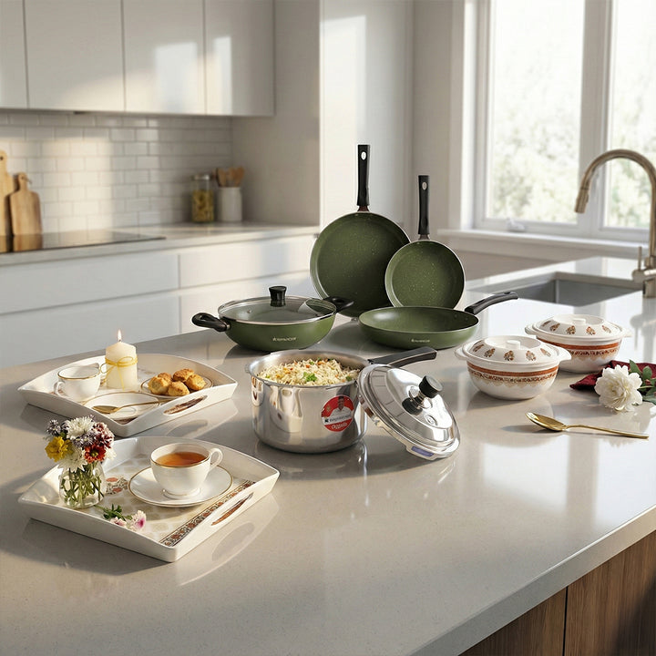 - VERSATILE: Cook delicious cutlets, stir-fry veggies, curries, dosas, uttapams, sandwiches, omelets, and parathas with the fry pan, kadhai, and tawa. Complete your cookware needs with Valencia set!