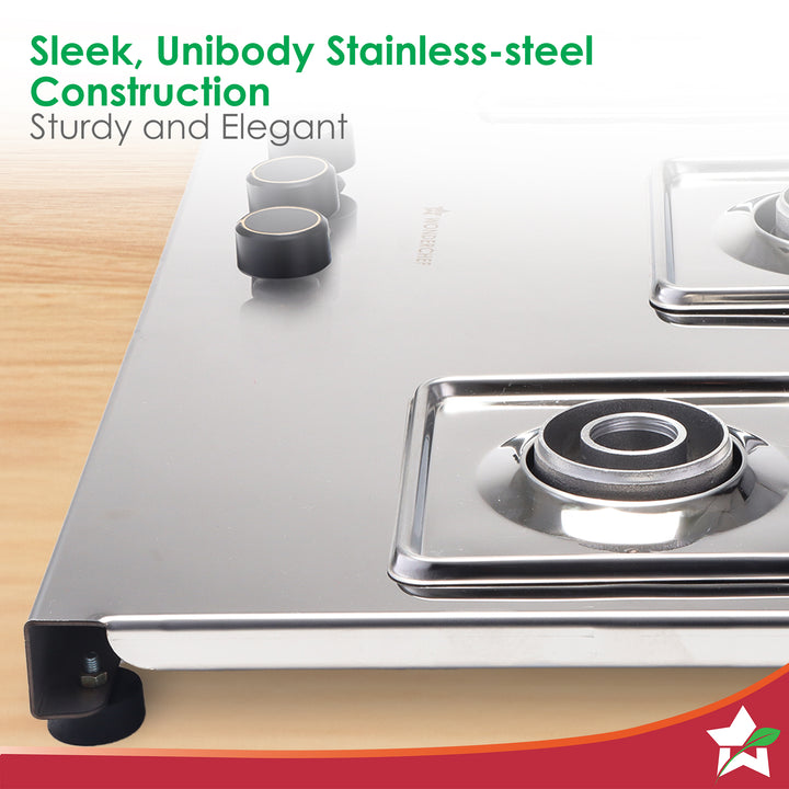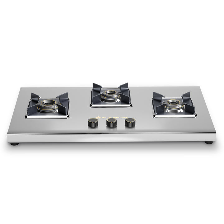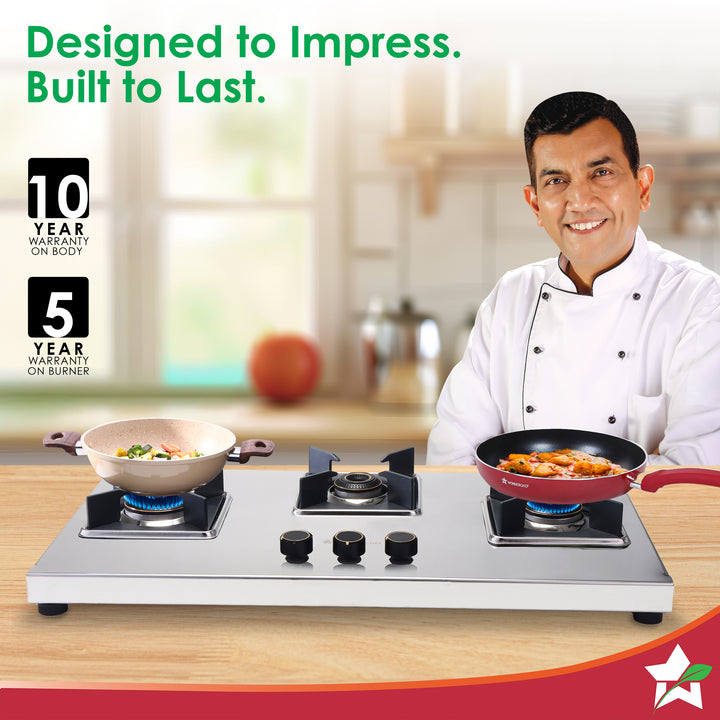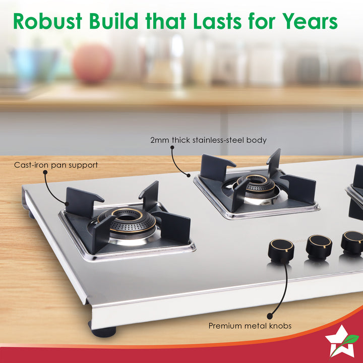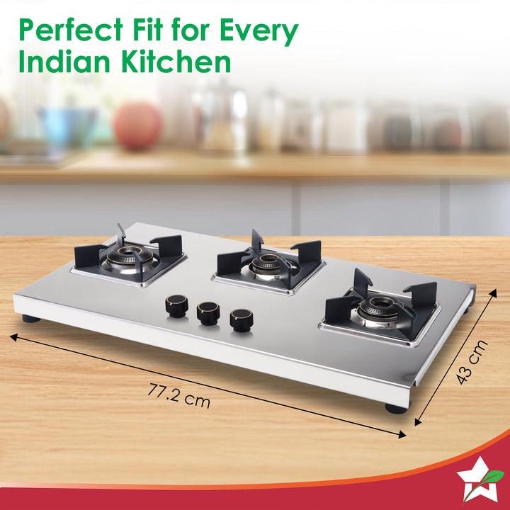 Inox 3 Brass Burner Hobtop, Thick Stainless-steel Construction, LPG Gas Stove for Kitchen, SABAF Leak-proof Valves, Spill-proof Design, Premium Metal Knobs, 2-Yr Warranty