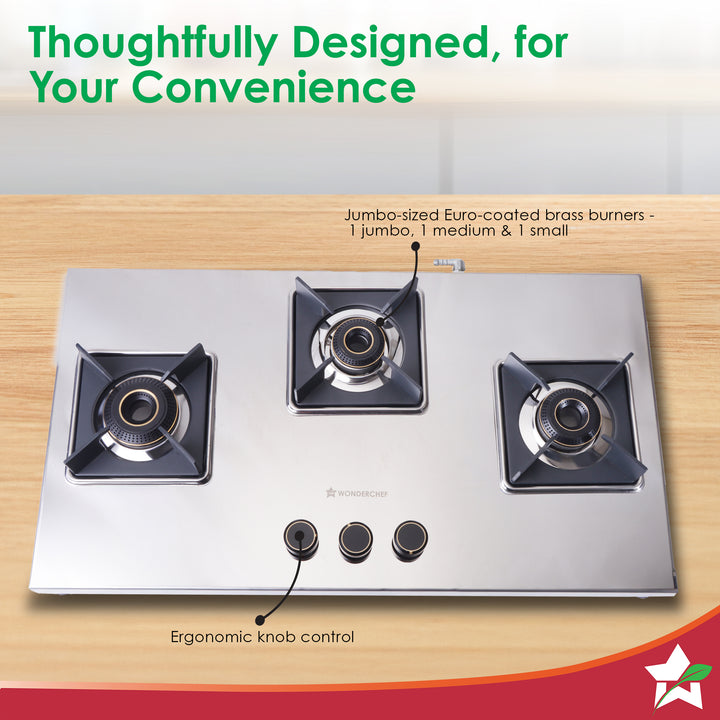 - 3 BURNERS: 1 jumbo, 1 medium and 1 small cater to different cooking needs.