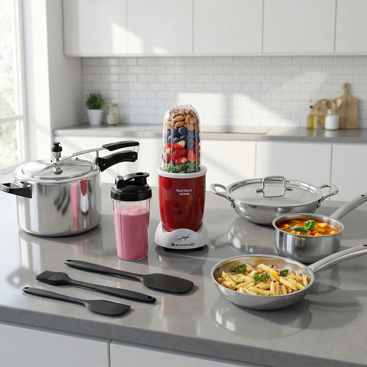Chef’s Premium Collection | Venice Triply Stainless Steel 4 Pc. Cookware Set, Nutri-blend Activ Mixer Grinder Blender, Ultima Induction Base 5L Aluminium Pressure Cooker With inner Lid, Ambrosia Silicone Kitchen Tools Set of 3 Pcs