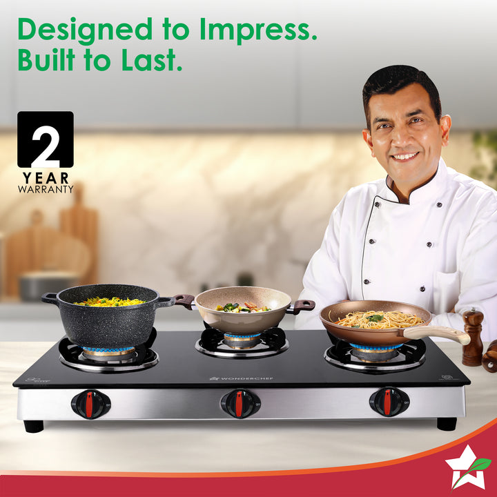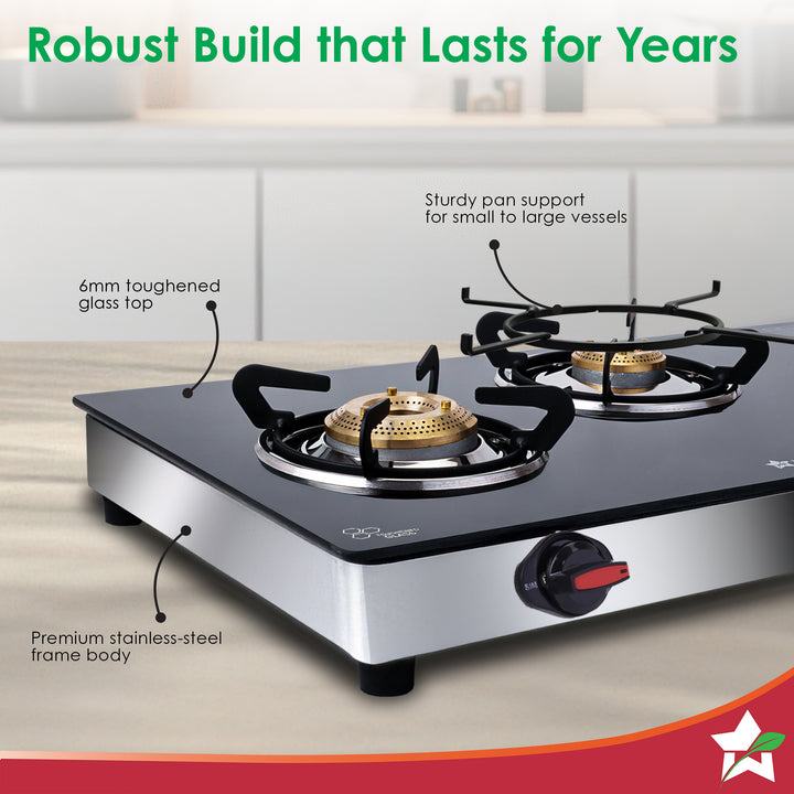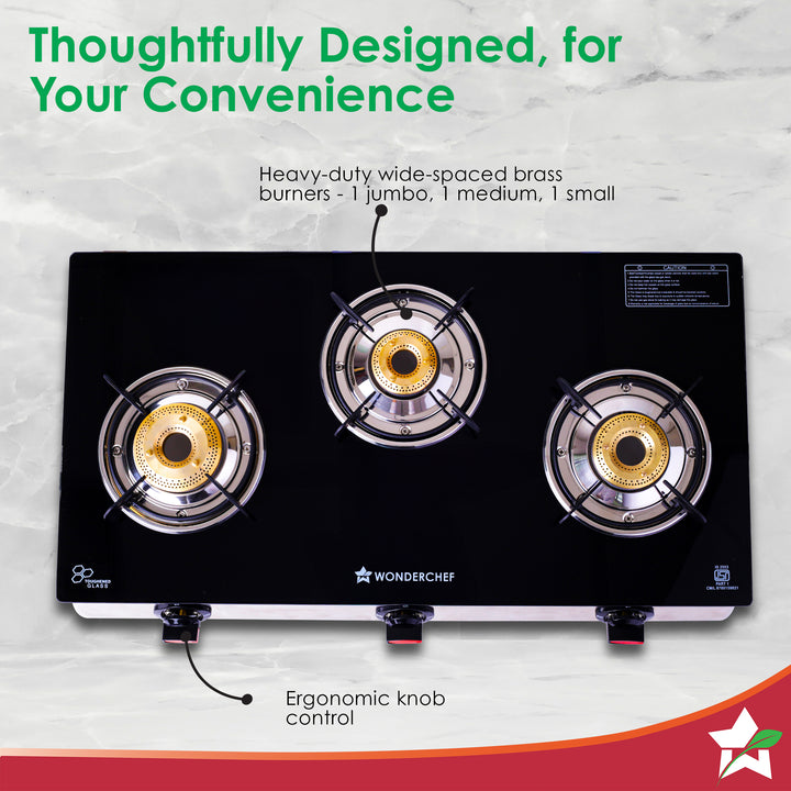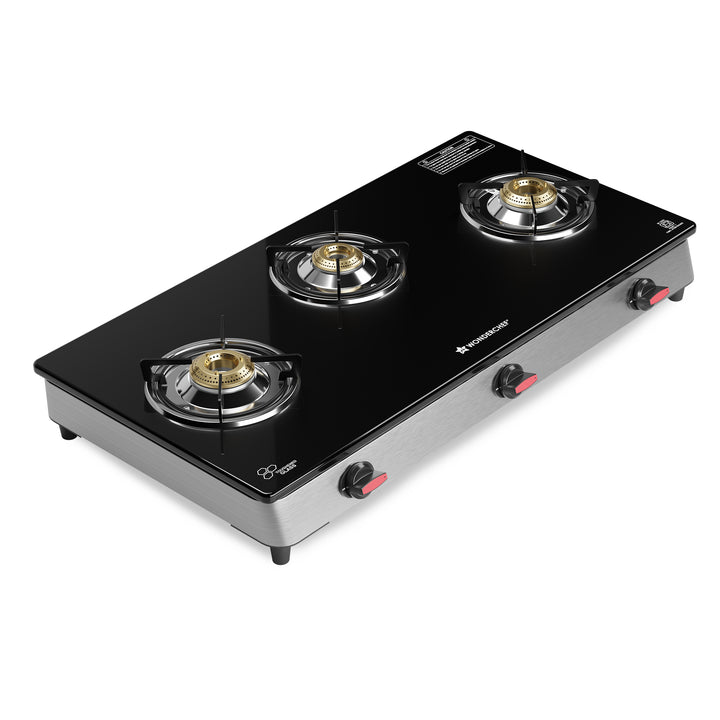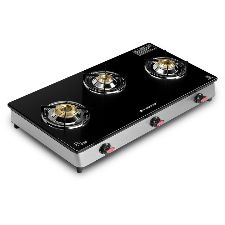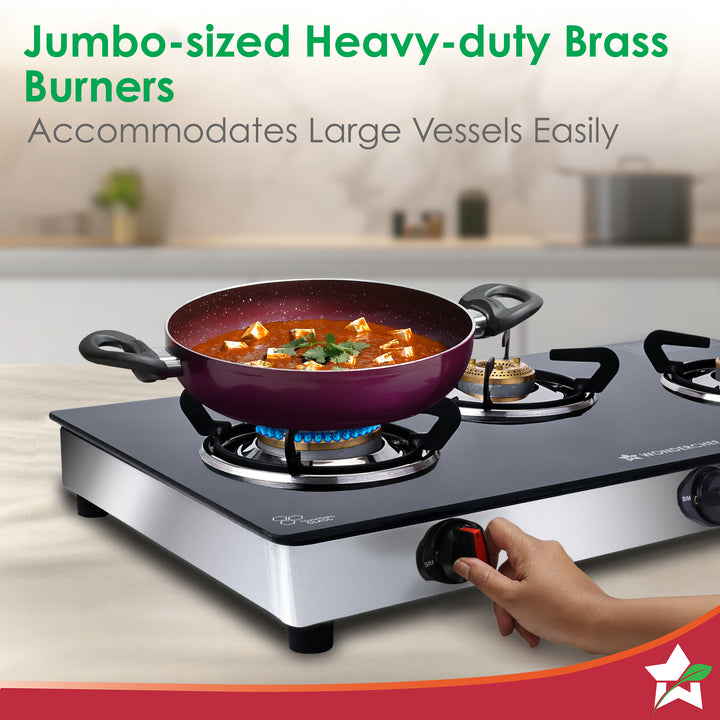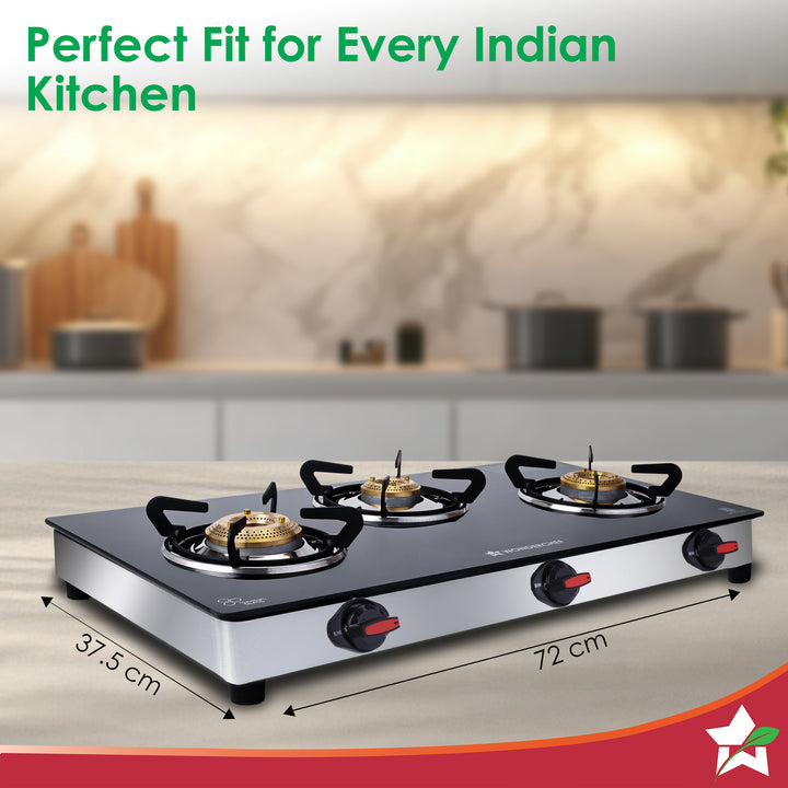 Regal 3 Brass Burner Cooktop, LPG Gas Stove for Kitchen, ISI Toughened Glass Surface, SS Frame, Spill-proof Design, Ergonomic Knobs, 2-Yr Warranty