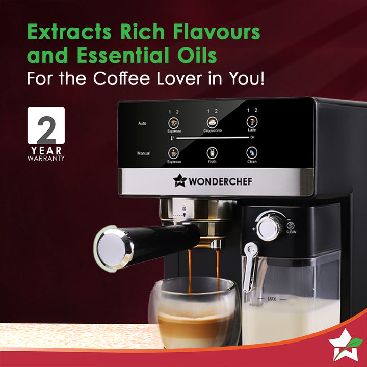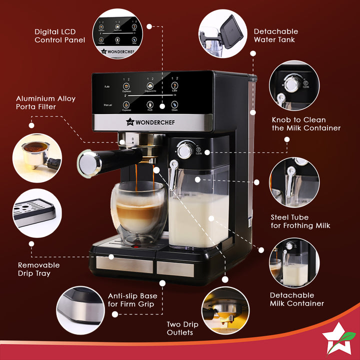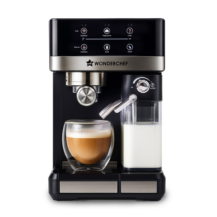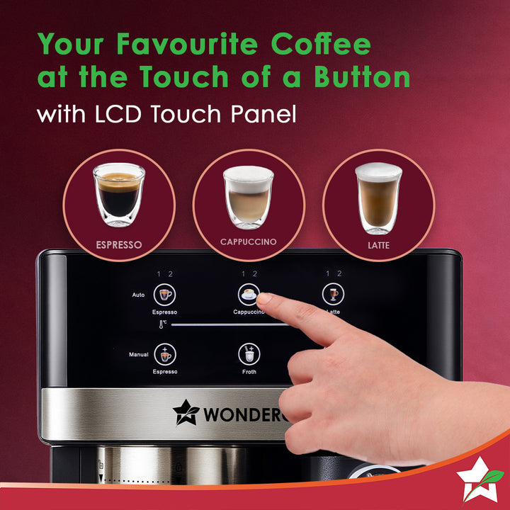 - ONE-TOUCH COFFEE EXPERIENCE: Wonderchef Regalia Automatic Coffee Machine allows you to enjoy your favourite coffee with simple touch of a button. Choose your favourite coffee on the digital panel and create the perfect espresso shot, hot cappuccino or latte.