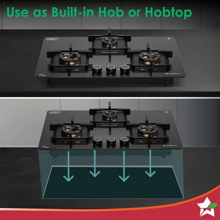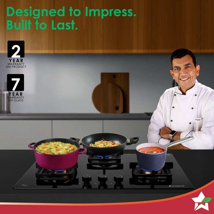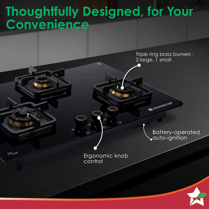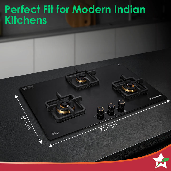 Venezia 3 Brass Burner Built-in Hob, 78cm x 52cm, LPG Gas Stove for Kitchen, ISI-approved 8mm Glass Top, Triple Ring Burners, No Lighter Required, Spill-proof Design, 5-Yr Warranty, Black