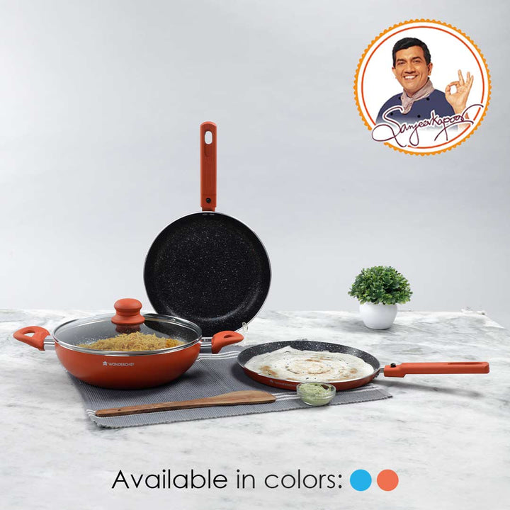 - Versatile 4-Piece Set: Experience the utmost convenience of cooking a diverse array of dishes with just one remarkable cookware set. Wonderchef Power Non-Stick Cookware Set comprises a Kadhai with Lid, Fry Pan, and Dosa Tawa, enabling you to effortlessly prepare an exquisite assortment of cutlets, curries, dosas, omelettes and more.